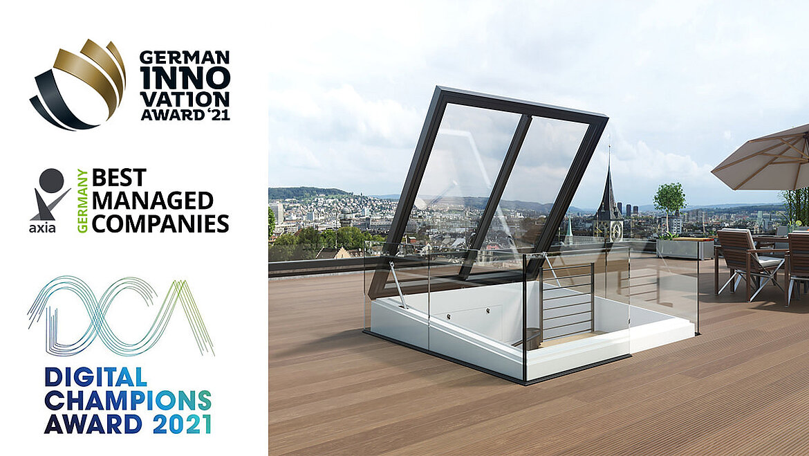 LAMILUX won no less than three awards at the German Design Awards 2020. The three daylight systems could hardly be more different, but they all won the German Design Award in the "Building and Elements" category: The Glass Skylight F100 Circular with concealed chain drive and the Glass Roof PR60 ventilation flap received the Winner award, while the Flat Roof Exit Comfort Swing for roof terraces was awarded the Special Mention. For the fifth time in a row, LAMILUX has thus convinced the jury, consisting of renowned economic and scientific experts, who annually present the German Design Award to products with pioneering design.