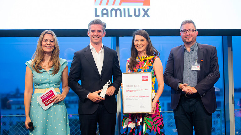 The family business LAMILUX has good reason to celebrate, as its managing directors Johanna and Dr Alexander Strunz were named “Bavarian young entrepreneurs of the year” at the Bavarian Family Business Congress on Thursday 29.06.23 at Hoch5 in Munich. The award recognises the commitment and achievements of the young entrepreneurs, who took the helm of the family business LAMILUX just a few days ago.