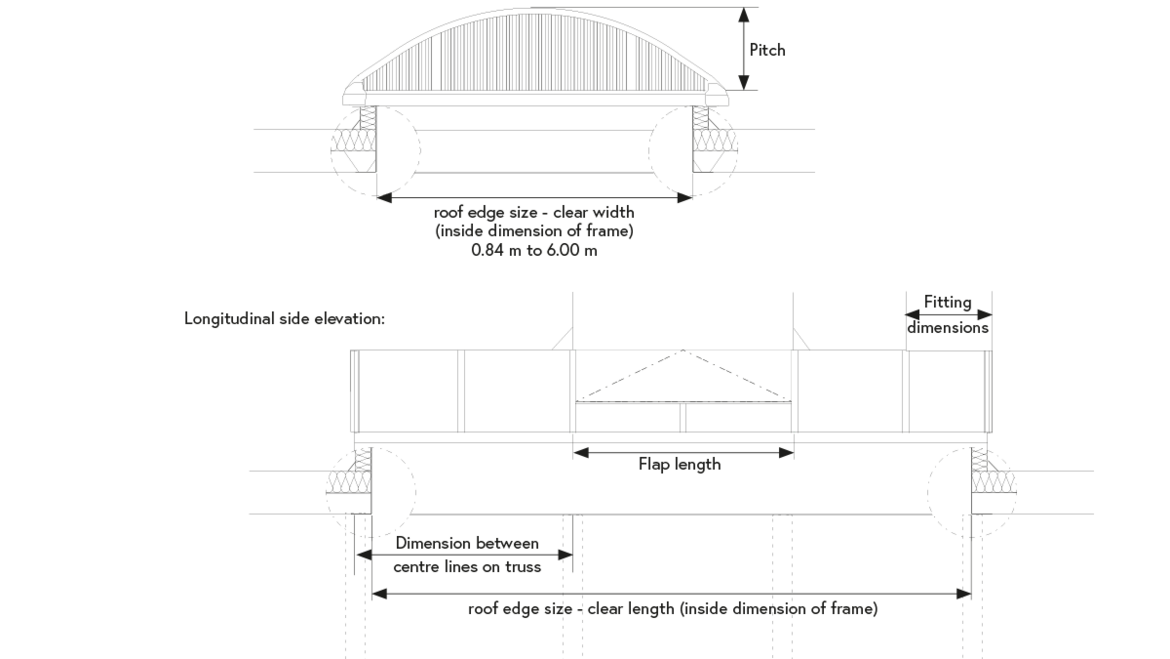 Note: Ug value is determined per DIN EN 673 (vertical installation). The profile structure's actual heat transmission values, including those of base profiles, gable wall profiles and flap profiles, have to be used to calculate the Continuous Rooflight's energy values.