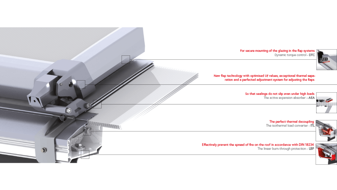 - Effective ventilating action with the Smoke Lift Continuous Rooflight B (DIN EN 12101-2), as a double or single flap