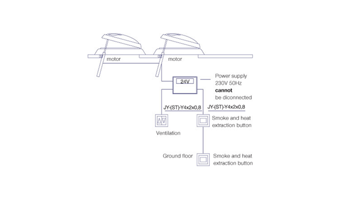 - Control unit for a maximum of two motors with control connectors for SHEV buttons, ventilation buttons and various peripherals such as smoke detectors*, thermal detectors* or wind and/or rain sensors* (*available as an option)