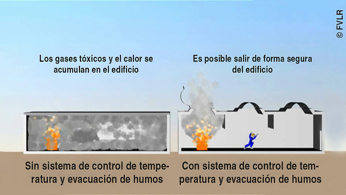 En las superficies de gran tamaño se deben instalar sistemas de control de temperatura y evacuación de humos en caso de incendio para garantizar un espacio con el menor humo posible en las áreas inferiores del edificio. De esta manera, se mantienen las vías de escape lo suficientemente libre de humos y se garantiza un acceso rápido para los bomberos. Esto facilita la extinción del fuego y el rescate de las personas heridas que no puedan abandonar el edificio por su propio pie. Con frecuencia, se puede evitar que un fuego incipiente se convierta en un gran incendio.